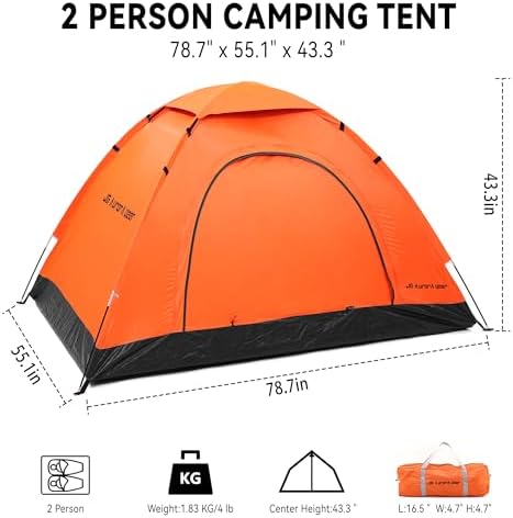 ?2 Person Tent:This lightweight two person small tent has enough space for you and a friend. This tent for camping is ideal for hiking, fishing, weekend music festivals, or as a beach tent, making it the perfect addition to your camping essentials. ?Conventient Features: The tent for beach features fiberglass poles, a removable rain fly to protect against unexpected weather, a ventilation window to encourage comfortable airflow. ?Dual Layer Door:The combination of the inner screen layer and the outer zippered fabric layer of the easy-up tent door provides plenty of air as well as privacy. Simply secure the doors with sewn-in ties to let the breeze in and keep mosquitos out. ?Easy to Set UP:The tents for camping 2 person that can be quickly assembled within 3 minutes and easily assembled by one person according to the procedures and instructions sewn inside the bag.At the end of your trip, simply return the tent assembly to the included carrying bag for easy storage with your other camping accessories. ?Product Details - Materials: 190T Polyester and Fiberglass.Silver Coated Tent Liner,Shade against sunlight and UV rays.Dimensions: (L) 78.7" x (W) 55.1" x (H) 43.3"; Pole Diameter: 6.9mm; Carrying Bag: (L) 16.5" x (W) 4.7". Weight: 4lbs. Capacity: 2 People. Color: Orange and Gray. ?Durable Material:Keeping yourself, your camping equipment, and your personal items dry when you are camping is half the battle. The sturdy nylon material on the tent body and the convenient rain fly help to ensure water does not make its way into the inside of your tent for an enjoyable, and dry, trip! ?Great for All Occasions – Get the most out of your two person tent during the year! The fiberglass poles and ventilation window allow you to utilize this tent for activities in the spring and summer. So, whether you need a tent for traveling, backpacking, hiking, festivals outdoors or whether you are headed out for a weekend camping trip with family and friends, this is an ideal tent to fit your needs. ?Responsible & Prompt Customer Service:Any material or workmanship problem happens, please contact with us first for a satisfied solution.