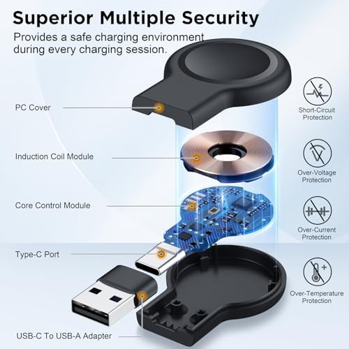 【Widely Compatibility】This upgraded charger designed for Apple Watch (model: Ultra2 Ultra SE2 SE Series 9 8 7 6 5 4 3 2 1, sizes: 49mm 45mm 44mm 42mm 41mm 40mm 38mm) , ensuring convenient charging for all Apple Watch users (ATTENTION: This battery charger is NOT a power bank). 【Two-Way Type Universal】Built-in USB-C interface and equipped with USB-A adapter dual-port design, suitable for almost all types of power ports in daily life, you can plug the charger into power bank/laptop/wall adapter/car or other devices with USB-A or USB-C charging ports to charge the watch. 【Cable-Free & Portable】No more messy cables, saving you from the hassle of winding cables! The compact & lightweight design is slip into pocket or bag easily and convenient to carry around. Perfect ideal for using at home, office, business trips, camping, travels and more daily use scenarios. 【Powerful Magnetic Adsorption】The watch can be adsorption when it touches the charger. The strong magnetism ensures the watch stays in the center of the charger and secures the watch from sliding off, provide a stable charging environment for your Apple Watch. 【Fast & Safe Charging】This portable charger for Apple Watch offers high speed battery charging experience just like original charger, which can fully charged your watch only takes 2~3 hours. And the safety features such as over-current, over-voltage, short-circuit and over-temperature protection protect your iWatch from damage caused by abnormal charging.